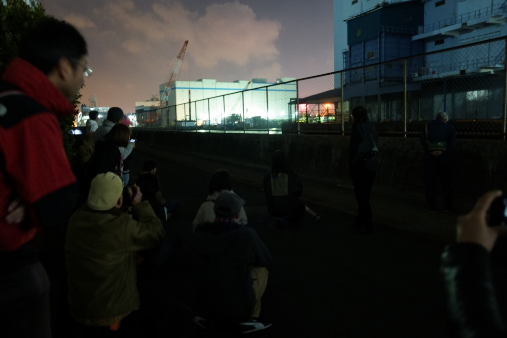イベント当日には、横浜大さん橋で花火が上がります。参加者はMRYの裏手に回って建物の隙間からちょっとだけ見える花火をありがたく鑑賞しました。