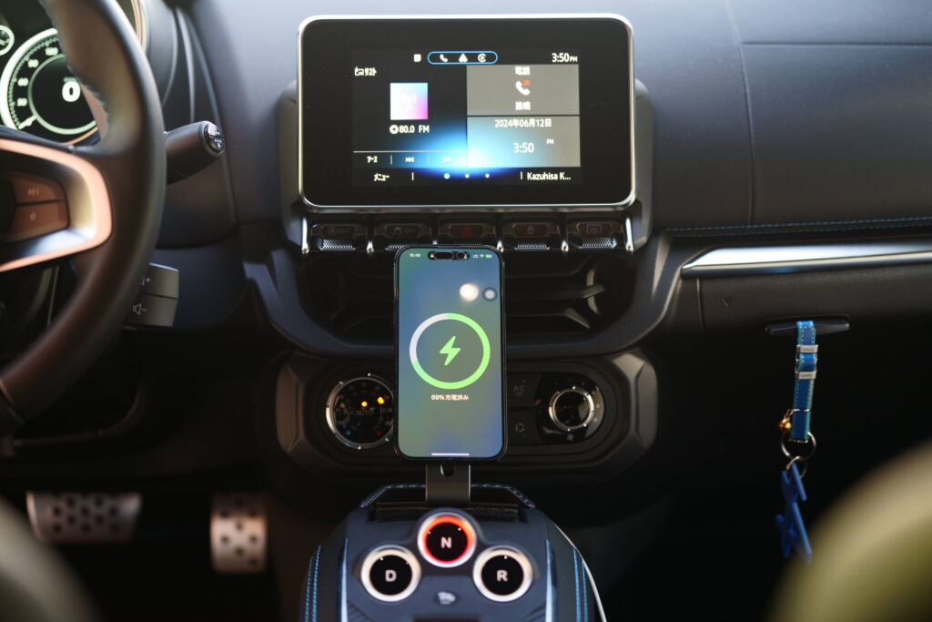 運転を楽しむのと、移動のために必要なものはありますが、この時代、スマホの置き場はスマートに決めておきたい。幸いにもA110は、iPhoneが車内にあればブルートゥースで自動的に繋がってカープレイに接続できますから、ポンと置くだけで充電もできるようになっていてほしい。