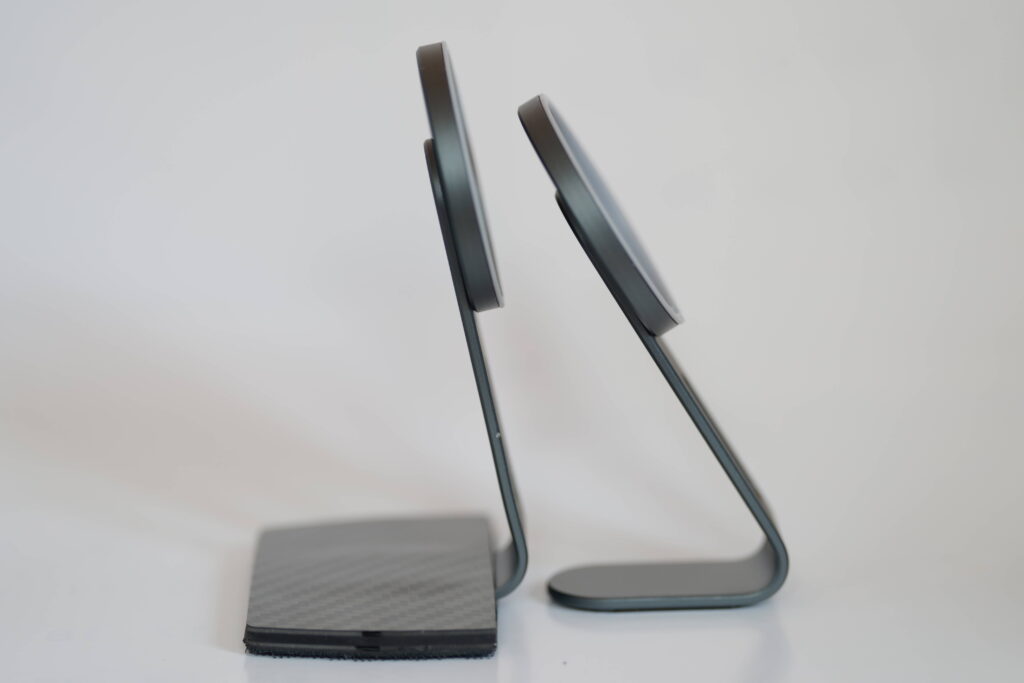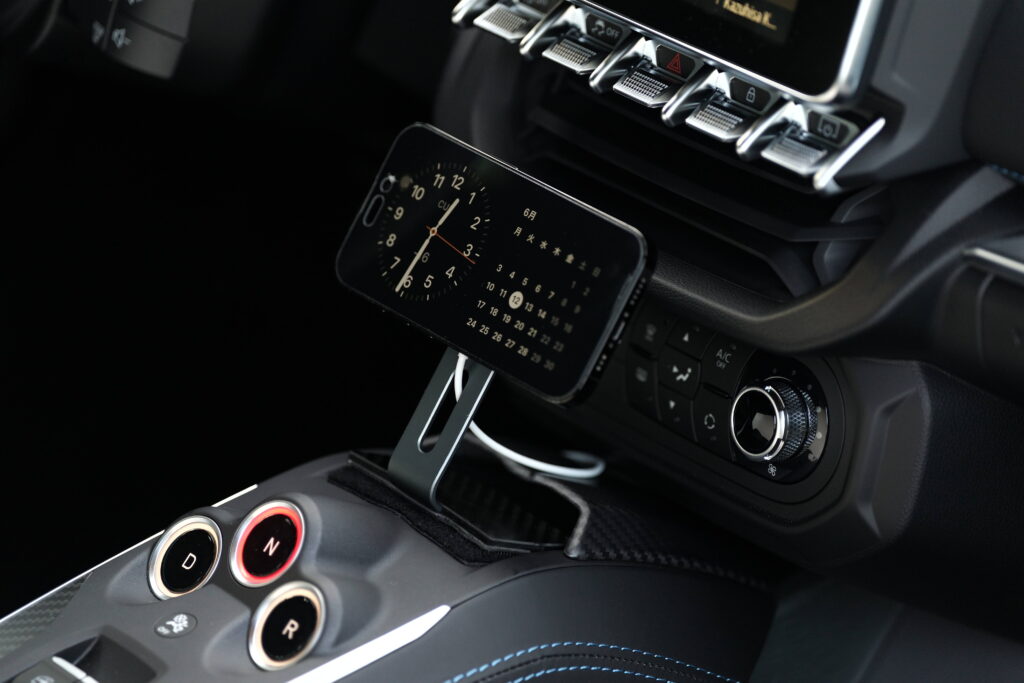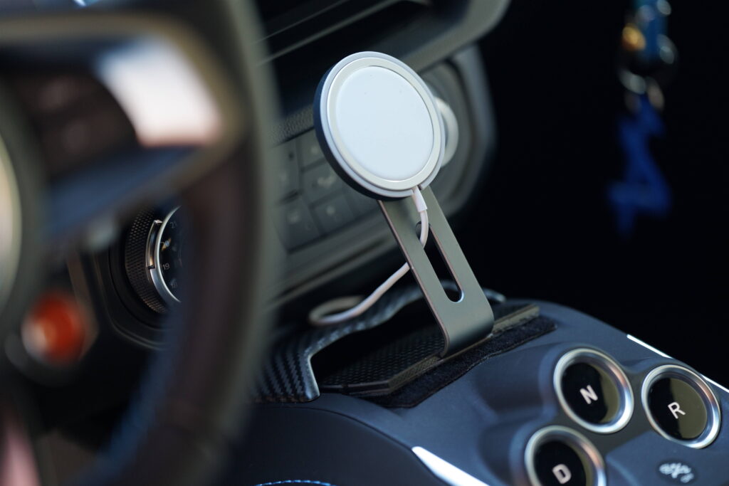まず、マグセーフ充電器を取り付けるスタンドを探します。これが意外と数多くないんですね。独自の非接触充電を備えたものはある程度見つけられたんですが、純正品装着タイプは少ない。それに、運転中の振動や加減速Gによって角度が変わってしまうことを考えると角度固定式が条件で、さらに色はグレーかブラックで。