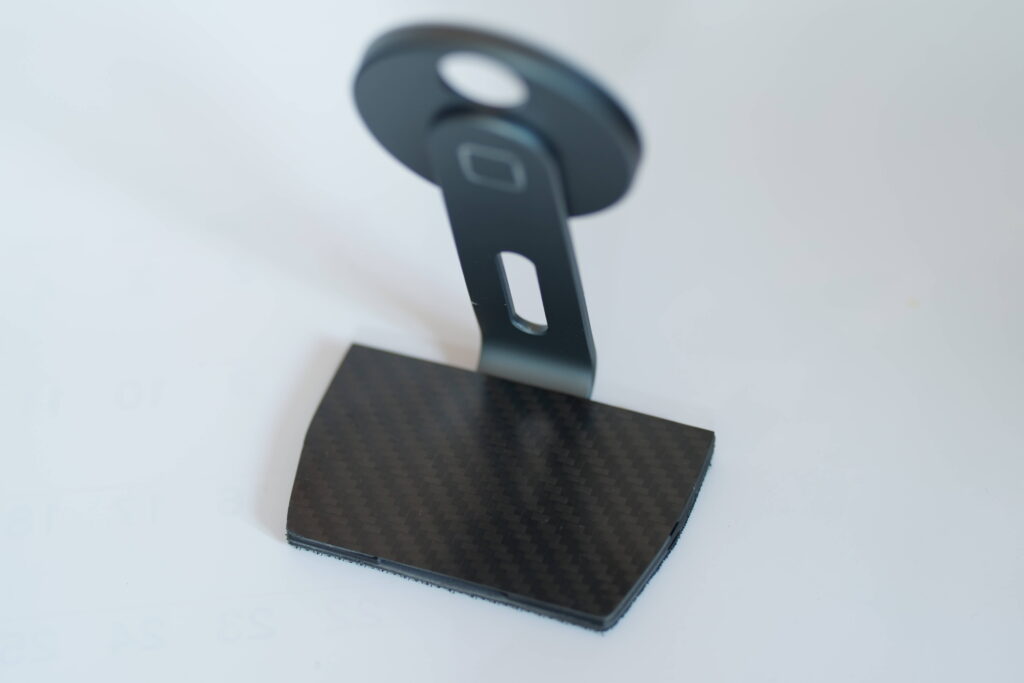 台座は、車両に取り付ける面ファスナー(いわゆるマジックテープ)、本体と高さを合わせるためのアクリル板、台座を上下で挟み最終的に見栄えを良くしてくれる名刺サイズのカーボン板、それにネットで強力だという両面テープを用意しました。