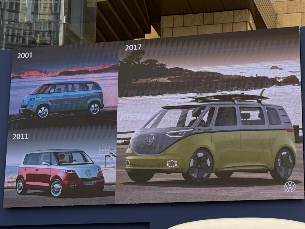 この内、ブリーはデザイン的にはデザインモチーフはワーゲンバスですが、2列シート6人乗り、一般的な3列ミニバンというより、フラットフロアのプラットフォームで電気自動車の可能性を訴えるようなモデルでした。車両は時を経ていくに連れ、フロントセンターのVWマークが少しずつ小さくなっていく気がします。