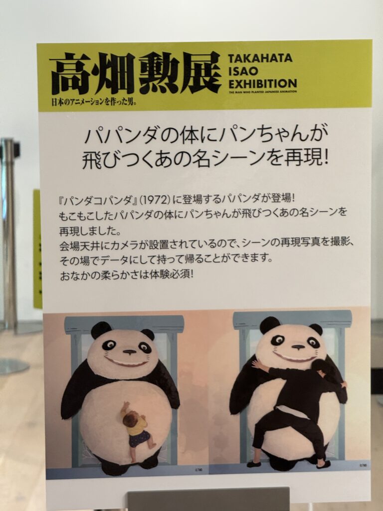 日本のアニメを作ったという高畑勲展では、1972年の懐かしいアニメ「パンダコパンダ」のパパンダに飛び載って、俯瞰から写真を撮ってくれるサービスがあったので早速やってみました。