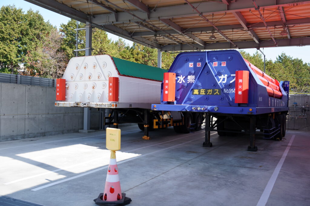 エンジンベンチへの水素供給は、大きなトレーラーに搭載された水素タンクから、周りを窒素で充填した二重管による配管で建屋内に送り込まれます。
