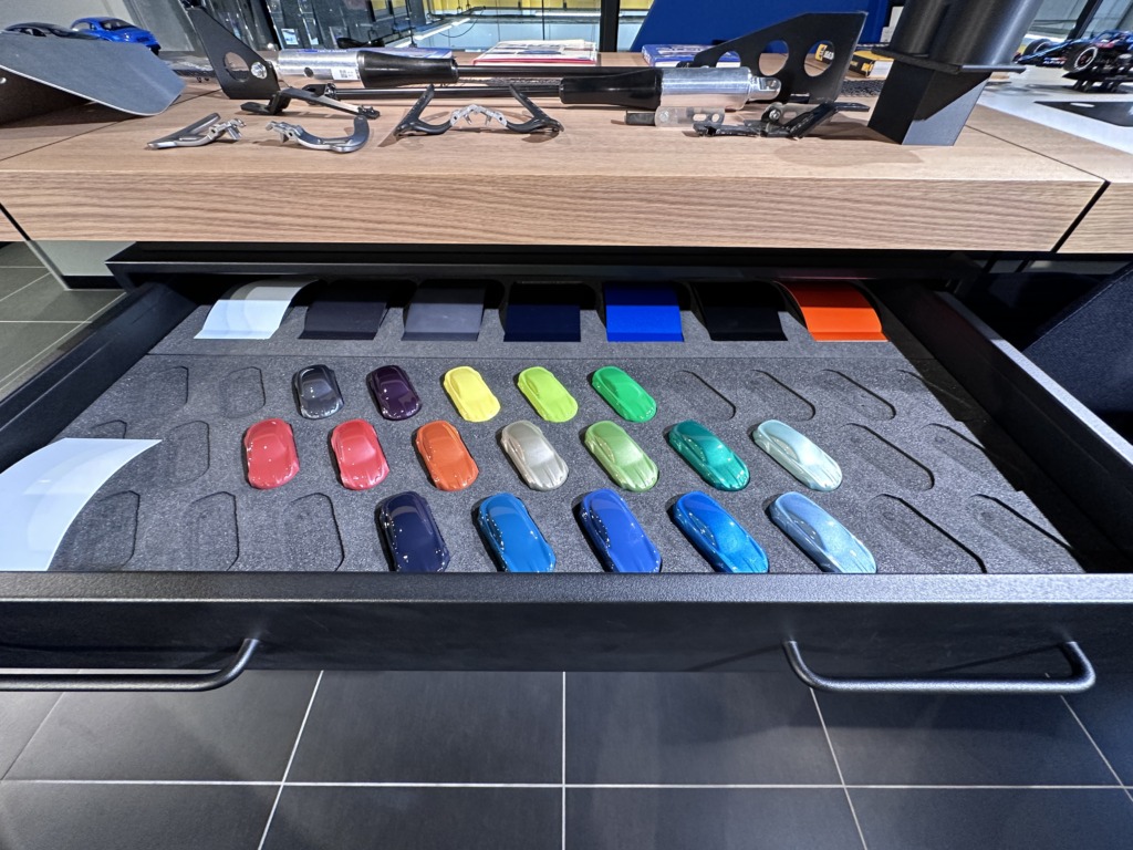 次に選ぶべきはカラー。A110は、追金ナシのスタンダードカラーと2種類の通常有償色に加え、過去のA110をオマージュした特別な有償色「ヘリテージカラー」が選べます。スタンダードは0円、スタンダードオプションが12万円と27万円、ヘリテージカラーが72万円(価格はいずれも契約時のもの)ですので、回らない寿司屋で言うところの、梅、竹、松いずれかの握りセット、またはカウンターでお任せで食べるような選択肢でしょうか。ヘリテージカラーにはめちゃ魅力的なカラーがありますが、車両本体価格の1割も色だけにお金は出せない貧乏性と、まあ何より一番似合うと素直に思えるブルーアルピーヌを選びました。