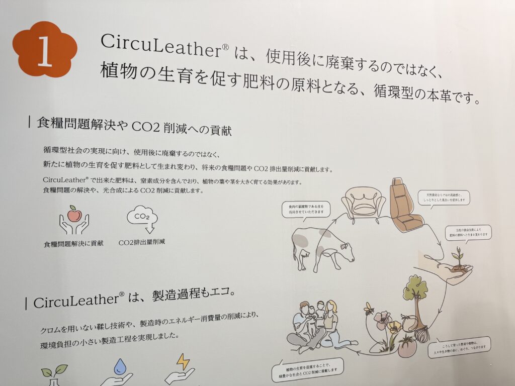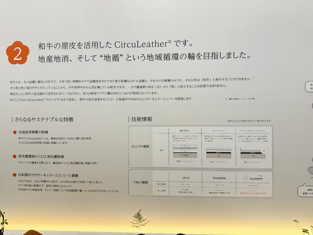 さて、人とくるまのテクノロジー展2025で、そんな疑問を解決してくれるブースに出会いました。CircuLeather(サーキュレザー)を展開するミドリオートレザー株式会社です。そちらでは、食用の肉としていただいちゃった牛さんの皮を革製品として利用している会社のようです。