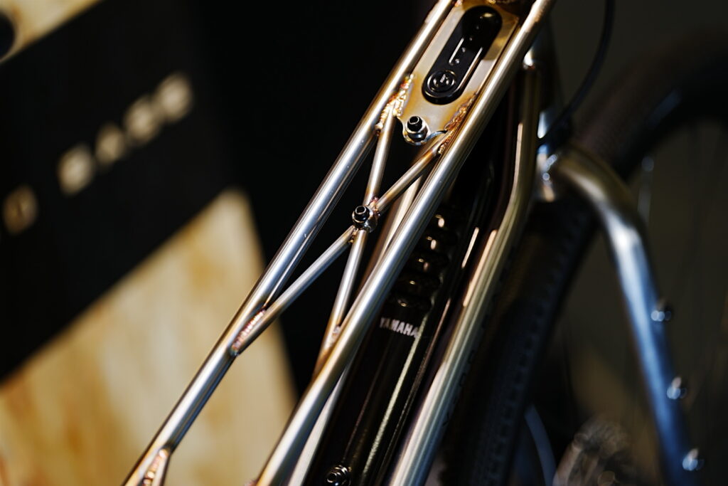 特徴的なフレームは、ヤマハ発動機eバイクのフラッグシップ「YPJ-MT Pro」で採用されたデュアルツインフレームと同様の構造で、トップチューブとダウンチューブがそれぞれ2本の計4本のトラス構造で構成され、ダウンチューブの左右のフレームの間にバッテリーを挟み込む。特許取得されているこのフレーム構造は、オートバイのクレードルフレームでエンジンを抱え込むという着眼点だ。「一般の自転車メーカーとは違う、オートバイメーカーのヤマハだからこその発想、差別化でもあります」と寳田さんは説明する。