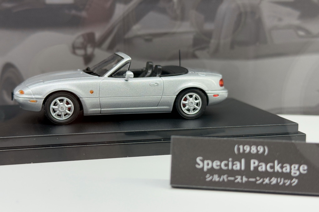 1/43 スケールで、初代が登場した1989年発売時にあったオリジナルの4色を始め、各限定車、特徴あるモデルが17台勢揃いしています。