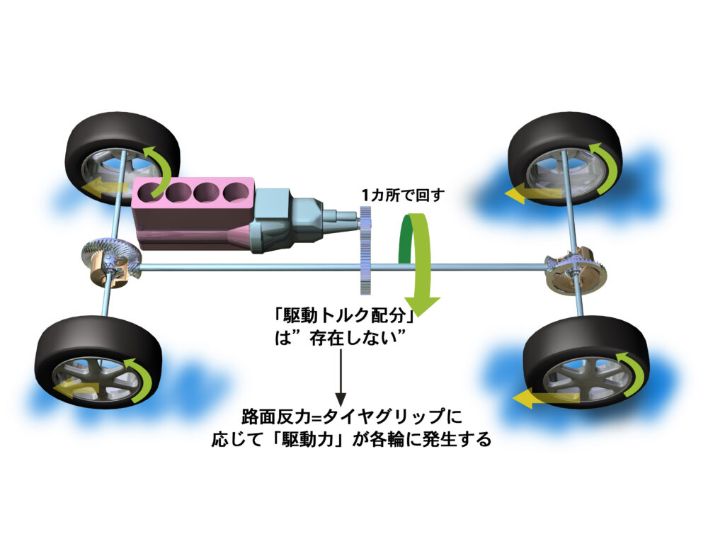 こういう「タイヤが滑る」状態で(じつはタイヤがわずかでも力を生んでいる時は、必ずなんらかの滑りがそこにあるのですが)、まず4つのタイヤによって得られる「クルマを押す力」を最大にするにはどうしたらいいか。これは簡単で、「4輪を機械的に“直結”にする」。